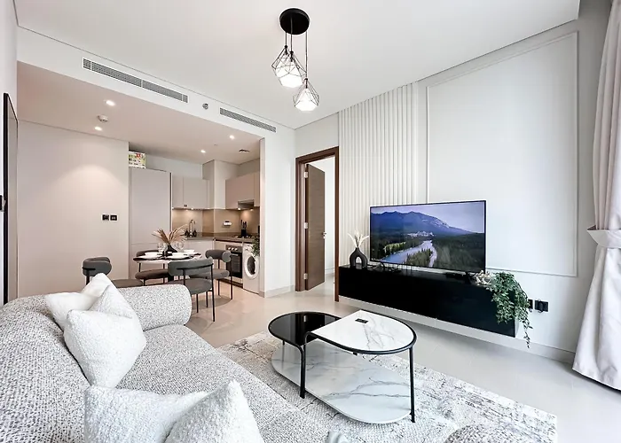 **The living spaces within the 2Br Creekfront in Shobha Hartland are thoughtfully designed to provide a bright and airy ambiance.** With contemporary furnishings and expansive windows that bathe rooms in natural light, guests will enjoy a refreshing atmosphere. The well-equipped kitchen allows for delightful home-cooked meals, while the sleek dining area is perfect for entertaining or relaxing after a day of exploration.